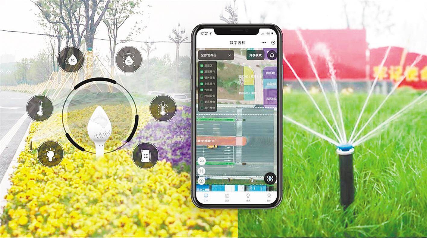 “手机上一点,就可以灌溉了。”王育新现场演示,在“数字园林”APP上找到光谷中心城该美化区间,一点“现在洒水”,喷灌设备立刻出水,转圈完成最大规模灌溉。