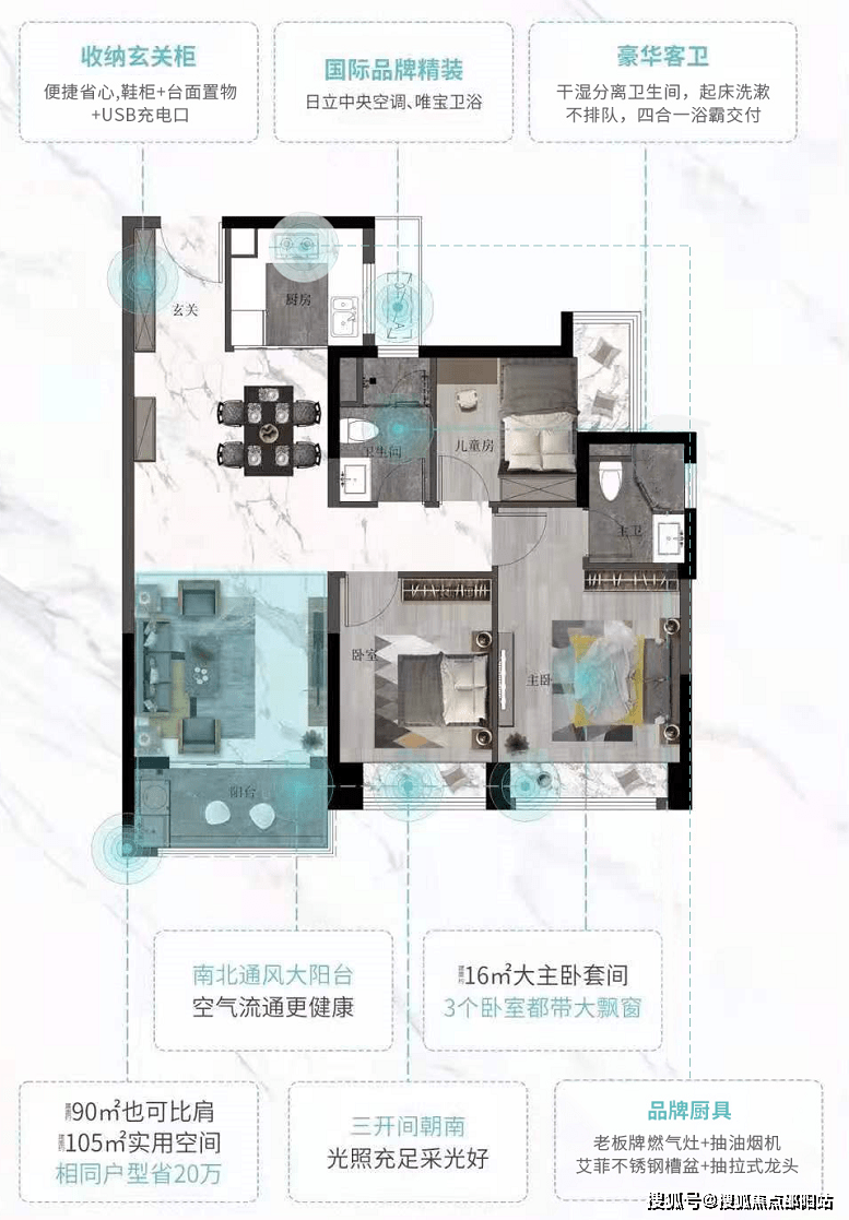 动态分区、南北通透、三开间采光的规划,确保每天阳光满足、空气流通,细菌天然无处容身。